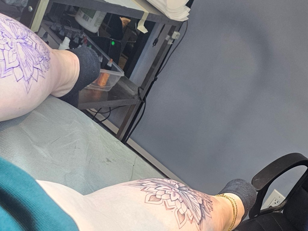 Mon tatoueur et moi prenons un moment pour photographier ces nouvelles œuvres; lui pour sa plateforme, moi pour ce blogue.